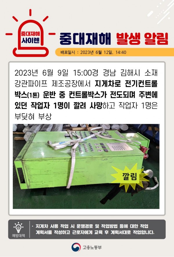 지게차 전기 컨트롤 박스 운반 중 깔림 재해. 페이지 정보 작성자 안전경영컨설팅 작성일23-08-31 16:47 조회4,285회 댓글0건 관련링크 이전글 다음글 목록 본문 . 댓글목록 등록된 댓글이 없습니다. 이전글 다음글 목록