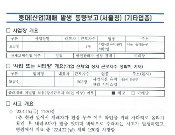 <중대재해> 천장 누수 확인 중 사다리에서 떨어짐 페이지 정보 작성자 안전경영컨설팅 작성일22-06-07 10:23 조회5,428회 댓글0건 관련링크 이전글 다음글 목록 본문 . 댓글목록 등록된 댓글이 없습니다. 이전글 다음글 목록