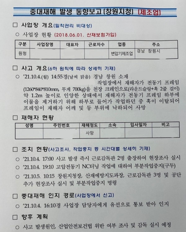 <중대재해> 크레인 변압기 프레임 운반 중 떨어짐