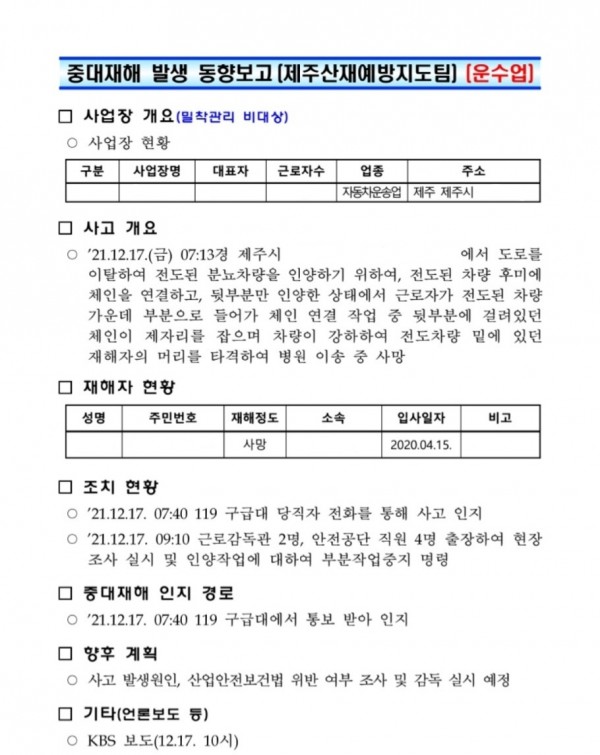 <중대재해> 전도된 차량 인양 중 맞음으로 인한 사망재해