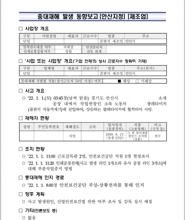 <중대재해> 골판지 제조업 골판지 자동적재기 진입으로 끼임 재해