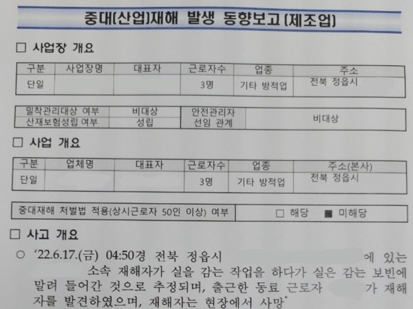 <중대재해> 실을 감는 보빈에 말려 끼임 페이지 정보 작성자 안전경영컨설팅 작성일22-07-14 09:12 조회5,586회 댓글0건 관련링크 이전글 다음글 목록 본문 . 댓글목록 등록된 댓글이 없습니다. 이전글 다음글 목록