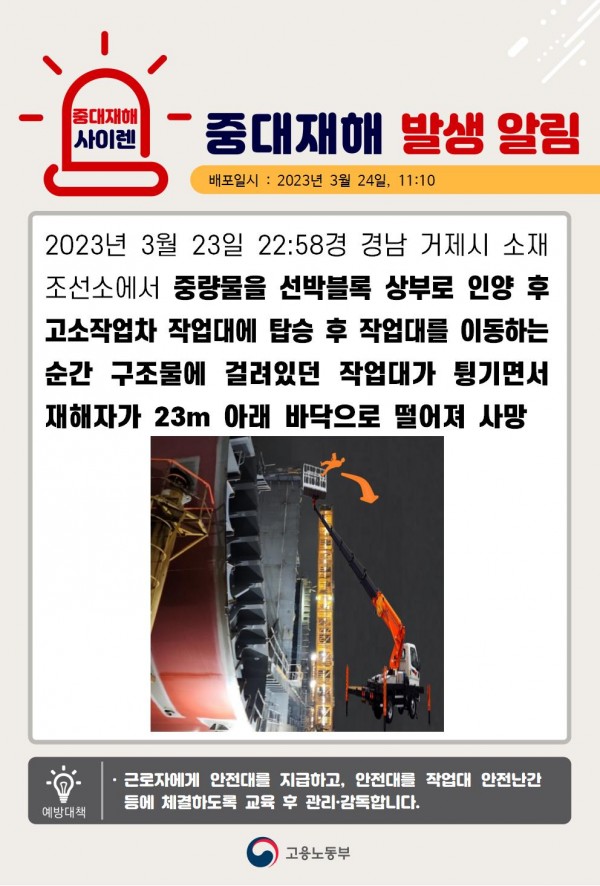 <중대재해> 조선소 고소작업차 작업 중 근로자 추락 페이지 정보 작성자 안전경영컨설팅 작성일23-03-28 09:04 조회4,502회 댓글0건 관련링크 이전글 다음글 목록 본문 . 댓글목록 등록된 댓글이 없습니다. 이전글 다음글 목록
