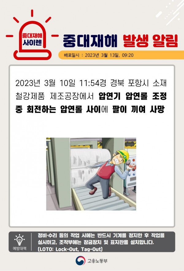 <중대재해> 철강제품 제조업 압연롤 끼임 재해 페이지 정보 작성자 안전경영컨설팅 작성일23-03-28 09:05 조회5,249회 댓글0건 관련링크 이전글 다음글 목록 본문 . 댓글목록 등록된 댓글이 없습니다. 이전글 다음글 목록