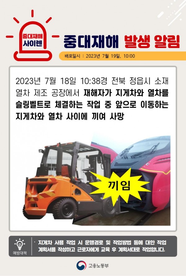 <중대재해>지게차와 열차 슬링벨트 체결 중 끼임사망 페이지 정보 작성자 안전경영컨설팅 작성일23-08-31 16:39 조회5,204회 댓글0건 관련링크 이전글 다음글 목록 본문 . 댓글목록 등록된 댓글이 없습니다. 이전글 다음글 목록