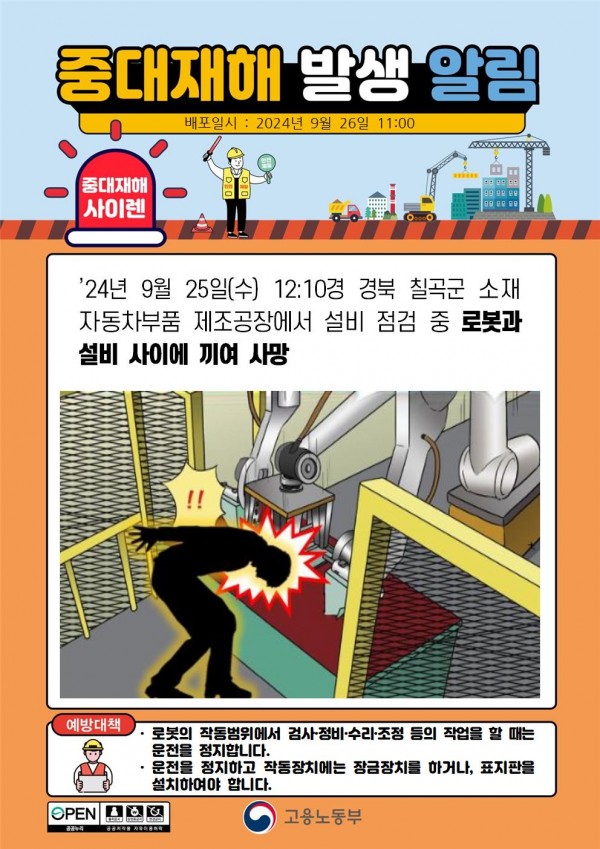 자동차부품 제조업 로봇과 설비 사이에 끼여 사망 페이지 정보 작성자 안전경영컨설팅 작성일24-11-11 08:46 조회3,066회 댓글0건 관련링크 이전글 다음글 목록 본문 . 댓글목록 등록된 댓글이 없습니다. 이전글 다음글 목록